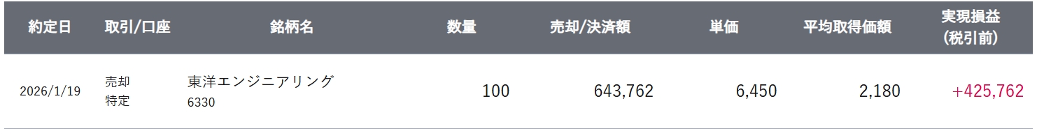 本日は、日経平均株価が下げる中、東洋エンジニアリングを売却した事で