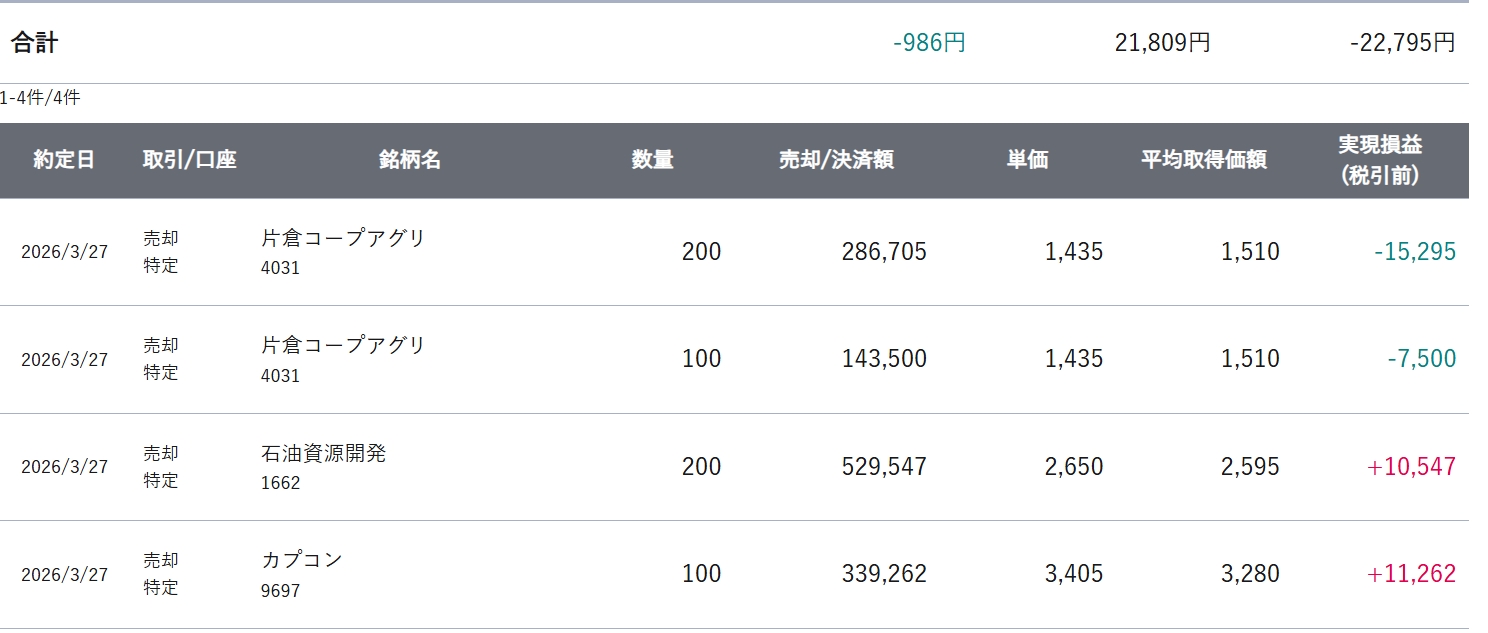 ここまでは良かったのですが、その後に購入した片倉コープ300株で、かなり下で指値したのですが更に底が抜けたかのように下げ始め・・見事に損切り。この取引で本日の利益を全て飛ばしてしまい戦意消失して本日終了となりました。-986円。
