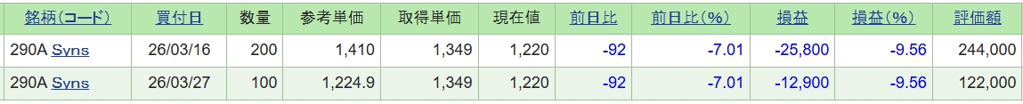 この後は、Youtubeでも見てのんびり過ごしたのですが、ちょっと気になりSynspectiveが大きく下げていたので100株だけ追加で購入しました。これで合計300株保有。