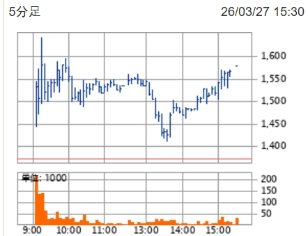 片倉コープの今日のチャートですが前場終了前に1510円で指値し、13時過ぎに購入となり直後に1413円まで急落したので、耐え切れず1435円まで戻ってきたところで処分したのですが、画像の通り後場終了の時には1580円で終えたようで見事にやられた感タップリです。敗北記念として記録に残しておきます。