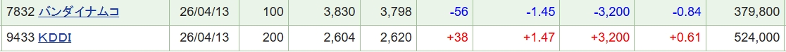 株取引 本日の取引 みかん 2026年4月13日 予想通り停戦交渉が決裂したので月曜は相当下げるだろうと思っていたのですが思いのほか日経平均は強く、421円の下げで終了しました。 日経平均が意外にも強かったので、本日は先週急落のKDDIと40万割れのバンナムを購入しました。本日は利確する前にまたしてもウトウトしてしまいまして持ち越し。数日間保有して利益確定する事に。 他にも買いたい銘柄はあったのですが、明日続落の展開でも買い出動できるように本日はこの2銘柄のみの購入。明日どうなるやら・・。トランプ大統領はそろそろ終わりが見えてきたのかも? ABOUT ME みかん 大阪在住の40代の孤独なおっさんです。 個人年金的なつもりで、株式投資を趣味として 日々細々とくらしています。 BLOG:http://oresamachan.com
