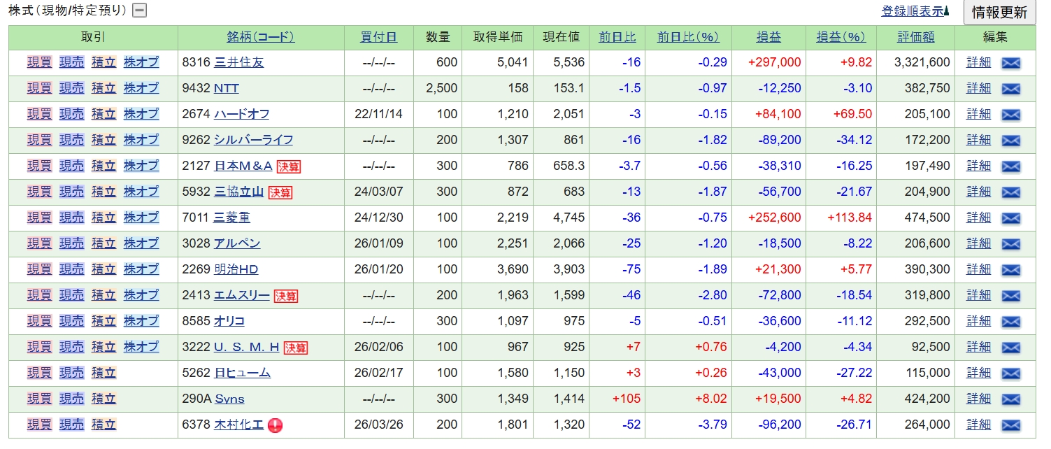 反対に木村化工機が地獄の展開。第二の三共立山と化しています。同じように数年単位で放置して配当を貰う展開でしょうか・・。