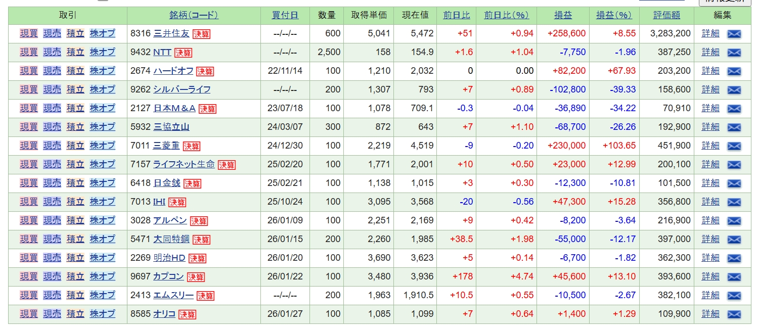 三井住友FGとオリコと日本M&Aが良い3rd決算発表をしてくれましたので、週明け期待しています。カプコンも買い戻しが入ったようで安心しました。2月末のバイオハザード新作の売れ行きに期待です。日本M&AもPTSでは上げていたので週明け期待です。株主優待の米目的で購入したのですが、継続保有縛り期間中に優待を廃止したので保有する意味は殆どなくなっているので、配当を貰いながら買値に戻る事を切望しております。
